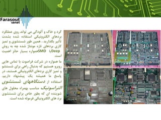 گرد و خاک و آلودگی می تواند روی عملکرد بردهای الکترونیکی استفاده شده بشدت تأثیر بگذارید ، همین طور شستشوی و تمیز کاری بردهای تازه مونتاژ شده چه به روش DIP یا SMD همواره بسیار حائز اهمیت است.