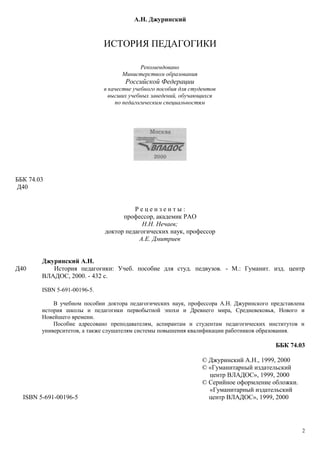 Учебное пособие А.Н. Джуринского охватывает историю педагогики от первобытной эпохи до современности, подчеркивая значимость изучения этой истории для формирования общей и педагогической культуры. Пособие является рекомендованным Министерством образования России и адресовано студентам и преподавателям педагогических вузов. В нем рассматриваются изменения в воспитании,School ومع cipedagogics в различные исторические эпохи, а также влияние социальных и культурных факторов на развитие образовательных систем.