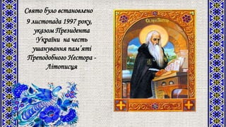 листопада 1997 року, указом Президента України на честь ушанування пам’яті Преподобного Нестора - Літописця