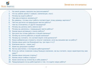 Документ представляет собой руководство по успешному прохождению собеседований и поиску работы, включая важные вопросы, которые могут быть заданы работодателем, а также советы по правильному составлению резюме и подготовки к интервью. Основное внимание уделяется пониманию требований работодателей и рынку труда, а также ключевым навыкам, нужным для получения желаемой должности. В заключение приводятся рекомендации по подготовке к собеседованиям и ошибкам, которых следует избегать.