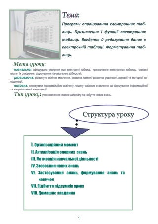 навчальна: сформувати уявлення про електронні таблиці, призначення електронних таблиць, основні