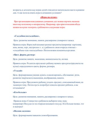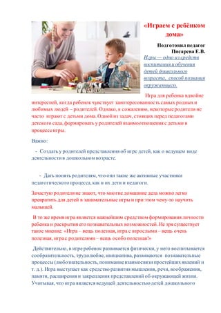Документ описывает важность игры в воспитании и обучении детей дошкольного возраста, акцентируя внимание на роли родителей как активных участников этого процесса. Подчеркивается, что игры способствуют развитию личных качеств и познавательных возможностей ребенка. Также предоставляются примеры игр, которые можно проводить дома для развития разных навыков у детей.