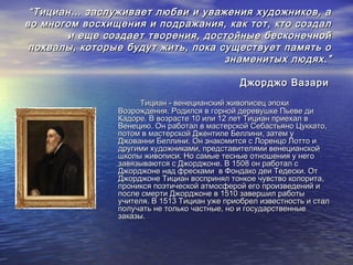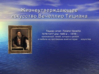 Тициан, выдающийся венецианский живописец эпохи Возрождения, известен своими работами, которые произошли под влиянием таких художников, как Джорджоне и Рафаэль. В его творчестве выделяются портретные и религиозные картины, отличающиеся яркими цветами и глубокой эмоциональной насыщенностью. Поздний период работы Тициана характеризуется тонким хроматизмом и свободной техникой письма, отражающей его философские идеи о человеке и жизни.