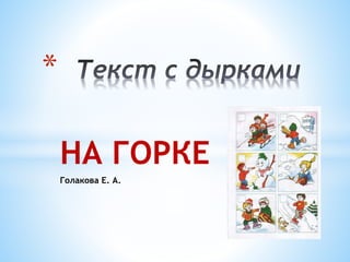 Документ описывает горку за двором, покрытую льдом, где дети с удовольствием катаются на санках и коньках. Каждый день там шумно и весело, особенно когда ребята скатываются с горки. Также в документе содержатся вопросы и задания, связанные с картинками и текстом для чтения.