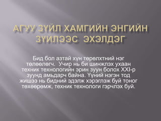 Агуу зүйл хамгийнэнгийн зүйлээс эхэлдэгБид бол азтай хүн төрөлхтний нэг төлөөлөгч. Учирньбишинжлэхухаантехниктехнологийнэринзуунболох XXI-р зуундамьдарчбайна. Үүний нэгэн тод жишээ нь бидний эдэлж хэрэглэж буй тоног төхөөрөмж, техник технологи гэрчлэх буй. - 3.