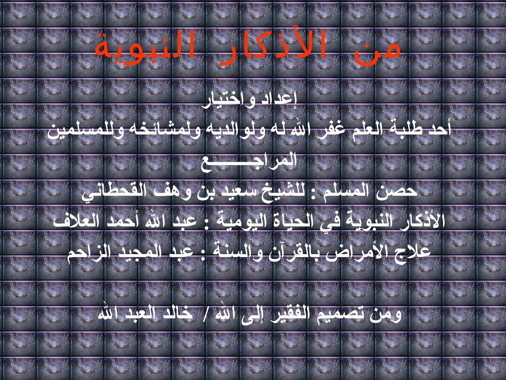 من الأذكار النبوية إعداد واختيار أحد طلبة العلم غفر الله له ولوالديه ولمشائخه وللمسلمين المراجـــــــــع حصن المسلم : للشيخ سعيد بن وهف القحطاني الأذكار النبوية في الحياة اليومية : عبد الله أحمد العلاف علاج الأمراض بالقرآن والسنة : عبد المجيد الزاحم ومن تصميم الفقير إلى الله / خالد العبد الله