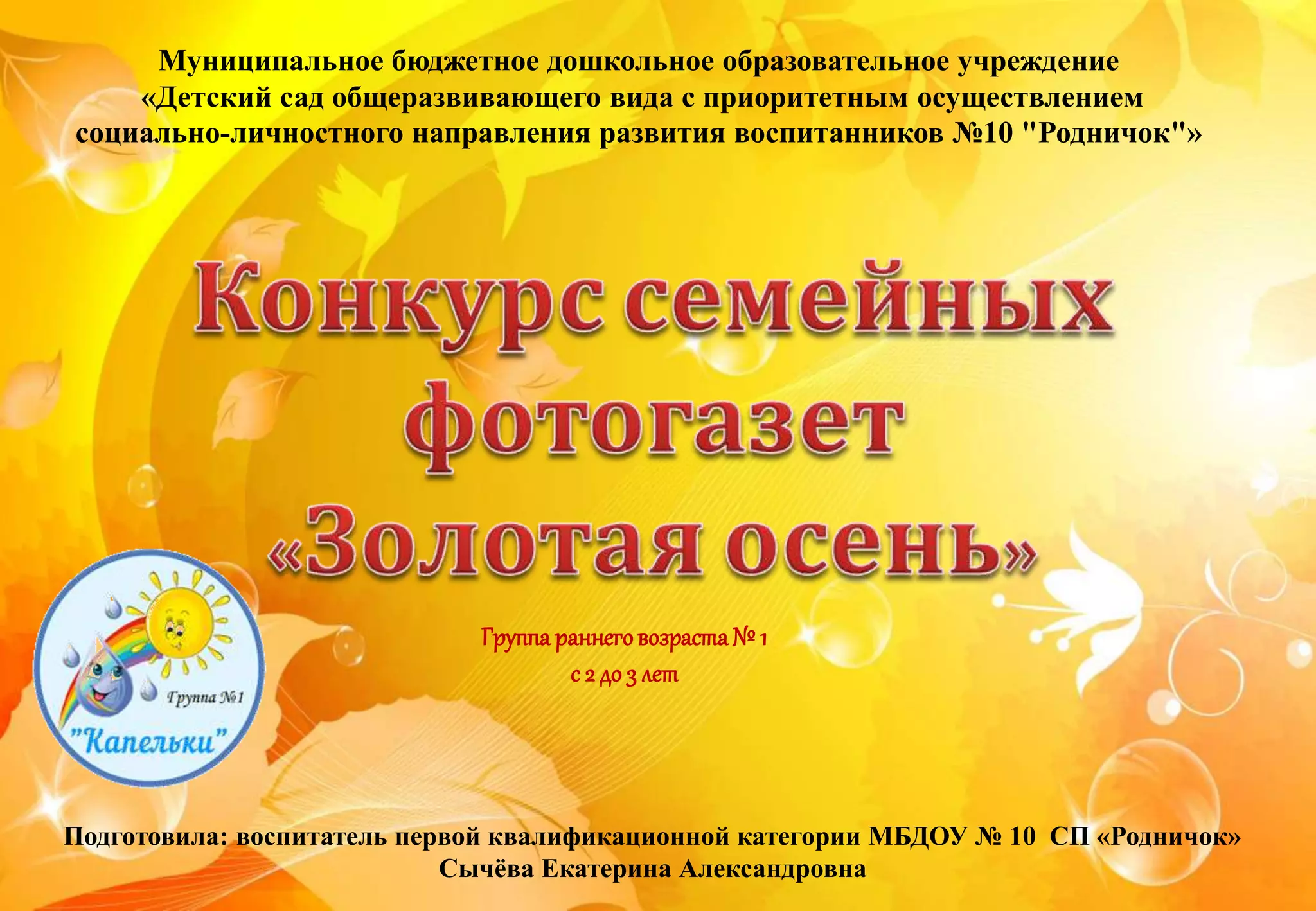 В документе описывается конкурс семейных фотогазет «золотая осень», проведённый в детском саду для детей 2–3 лет с 05.10.2016 по 12.10.2016. Основные задачи конкурса заключались в приобщении детей и родителей к совместной деятельности, формировании представлений о природе и воспитании бережного отношения к ней. Участие родителей в создании фотогазет с использованием фотографий и аппликаций способствовало развитию творчества, а дети испытывали радость от совместного просмотра работ.