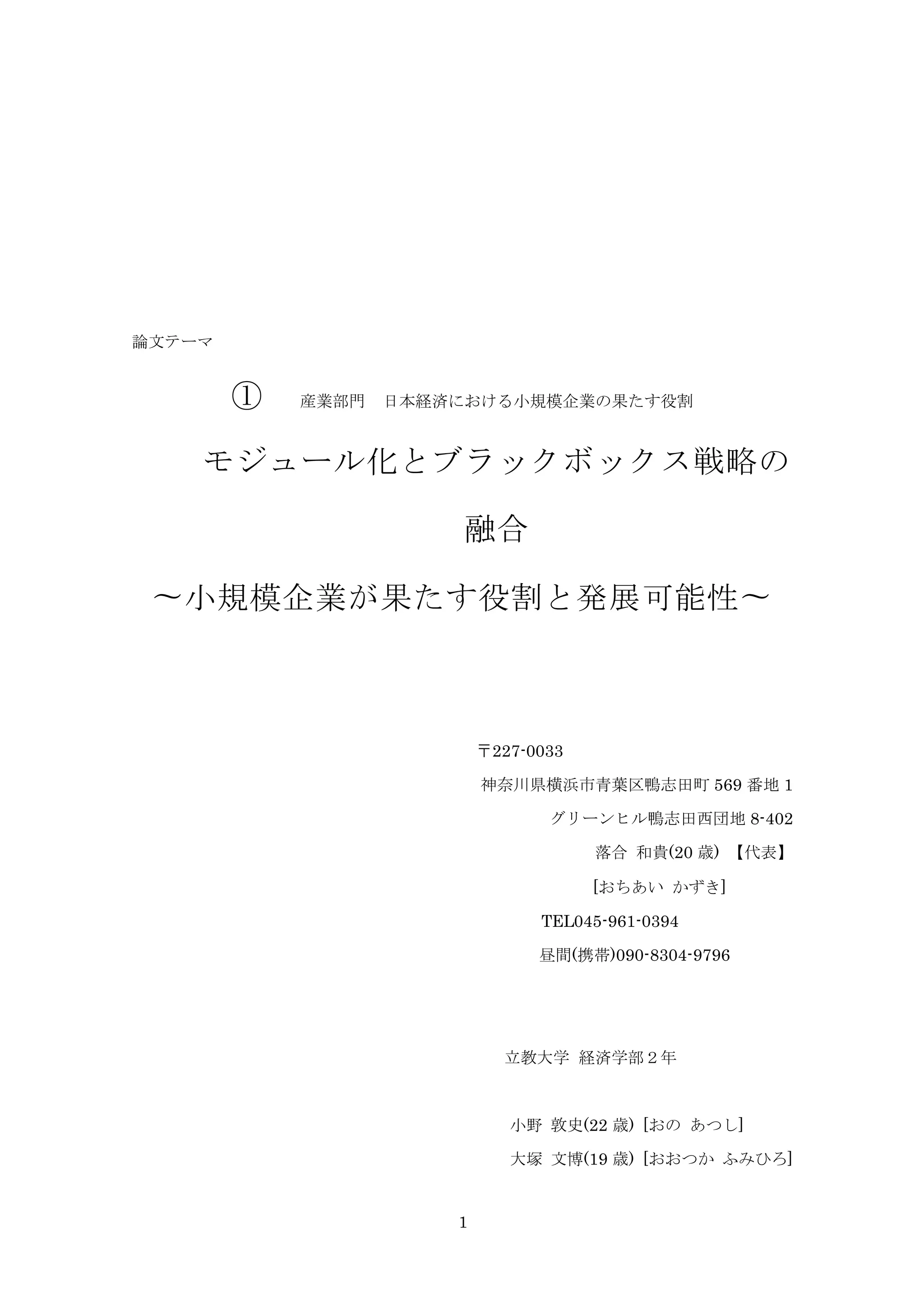 中小企業と製造業をテーマに、衰退しているといわれる日本製造業の現状と課題を分析、海外企業との比較を行った後に、解決案としてモジュール化とブラックボックス化の重要性を論じている。