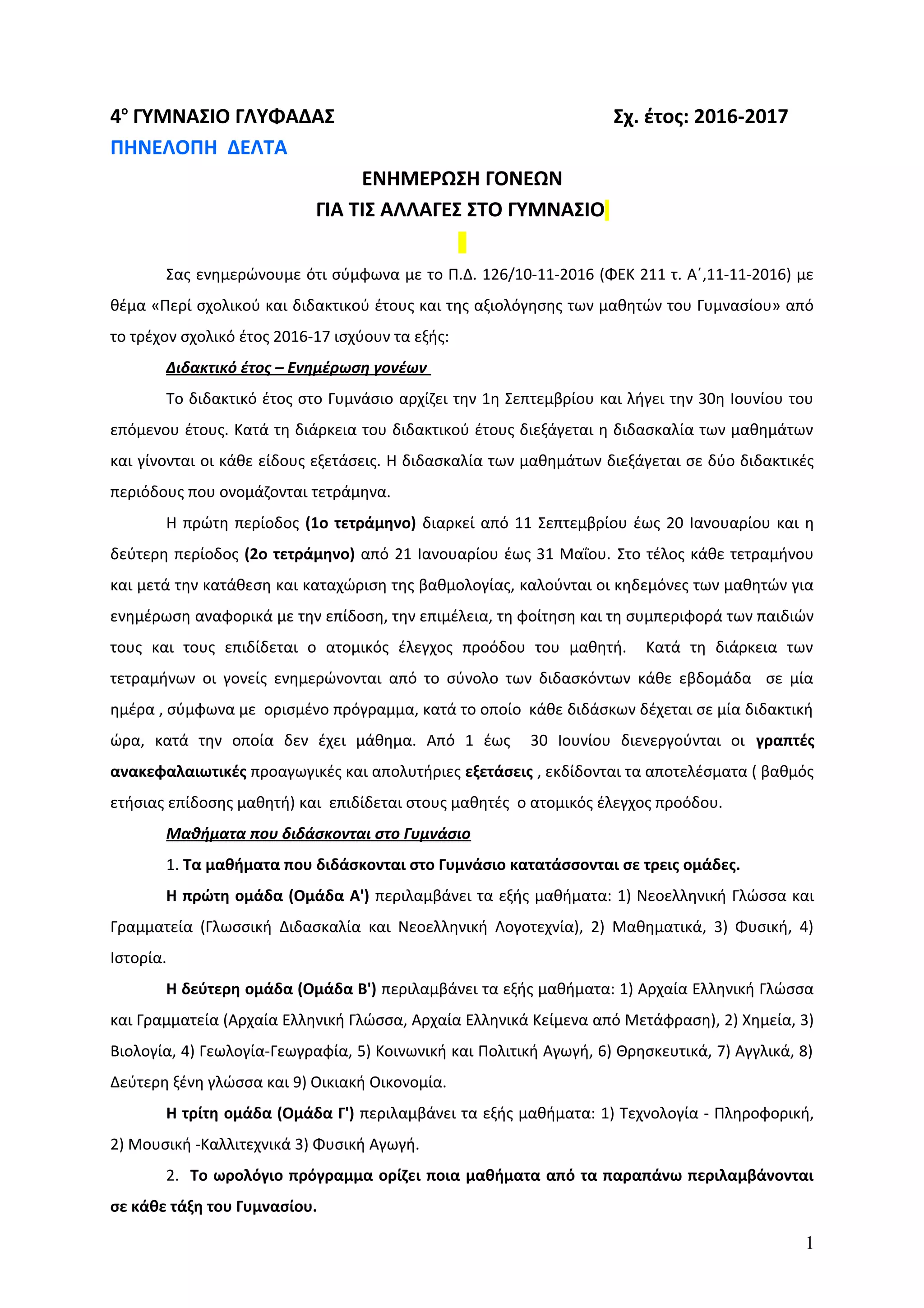 ΓΙΑ ΤΙΣ ΑΛΛΑΓΕΣ ΣΤΟ ΓΥΜΝΑΣΙΟ