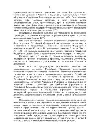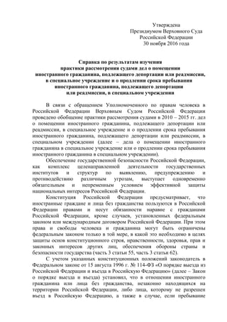 Документ представляет собой справку о практике рассмотрения дел о помещении иностранных граждан, подлежащих депортации или реадмиссии, в специальные учреждения в России с 2010 по 2015 годы. Он подчеркивает важность обеспечения государственной безопасности и прав иностранцев в соответствии с Конституцией и международными договорами. Обобщение показывает, что большинство дел рассматривались судами своевременно, хотя имели место случаи нарушения сроков подачи заявлений и отсутствия указания конкретных сроков содержания.