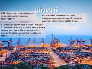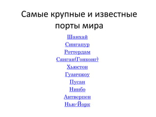 Документ описывает наиболее крупные и известные порты мира, включая Шанхай, Сингапур, Роттердам, Гонконг, Хьюстон, Гуанчжоу, Пусан, Нинбо, Антверпен и Нью-Йорк. Порт Шанхай занимает первое место по грузообороту, в то время как Сингапур и Роттердам следуют за ним. Каждый порт имеет свои уникальные характеристики и CONTRIBUTES к мировым морским грузоперевозкам.