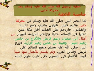 تتناول الوثيقة خطبة النبي محمد صلى الله عليه وسلم بعد معركة حنين، حيث تحدث إلى الأنصار ليطمئنهم عن توزيع الغنائم التي أوصى بها للمؤلفة قلوبهم. استخدم النبي أسلوب الاستفهام ليذكر الأنصار بفضلهم ويدعوهم للرضا عن موقفه، مما أدى إلى تأثرهم الشديد وإقرارهم بفضل النبي عليهم. الخطبة تعكس مهارات النبي البلاغية ومكانة الأنصار في المجتمع الإسلامي.