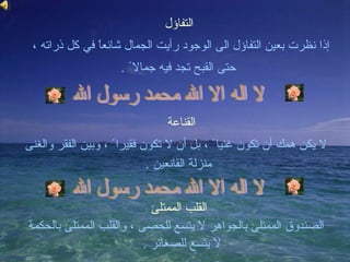 التفاؤل إذا نظرتبعين التفاؤل الى الوجود رأيت الجمال شائعاً في كل ذراته ، حتى القبح تجد فيه جمالا ً . لا اله الا الله محمد رسول الله القناعة لا يكن همك أن تكون غنيا ً ، بل أن لا تكون فقيرا ً ، وبين الفقر والغنى منزلة القانعين . لا اله الا الله محمد رسول الله القلب الممتلئ الصندوق الممتلئ بالجواهر لا يتسع للحصى ، والقلب الممتلئ بالحكمة لا يتسع للصغائر .
