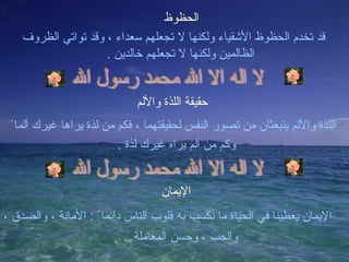 الحظوظ قد تخدمالحظوظ الأشقياء ولكنها لا تجعلهم سعداء ، وقد تواتي الظروف الظالمين ولكنها لا تجعلهم خالدين . لا اله الا الله محمد رسول الله حقيقة اللذة والألم اللذة والألم ينبعثان من تصور النفس لحقيقتهما ، فكم من لذة يراها غيرك ألما ً وكم من ألم يراه غيرك لذة . لا اله الا الله محمد رسول الله الإيمان الإيمان يعطينا في الحياة ما نكسب به قلوب الناس دائما ً : الأمانة ، والصدق ، والحب ، وحسن المعاملة .