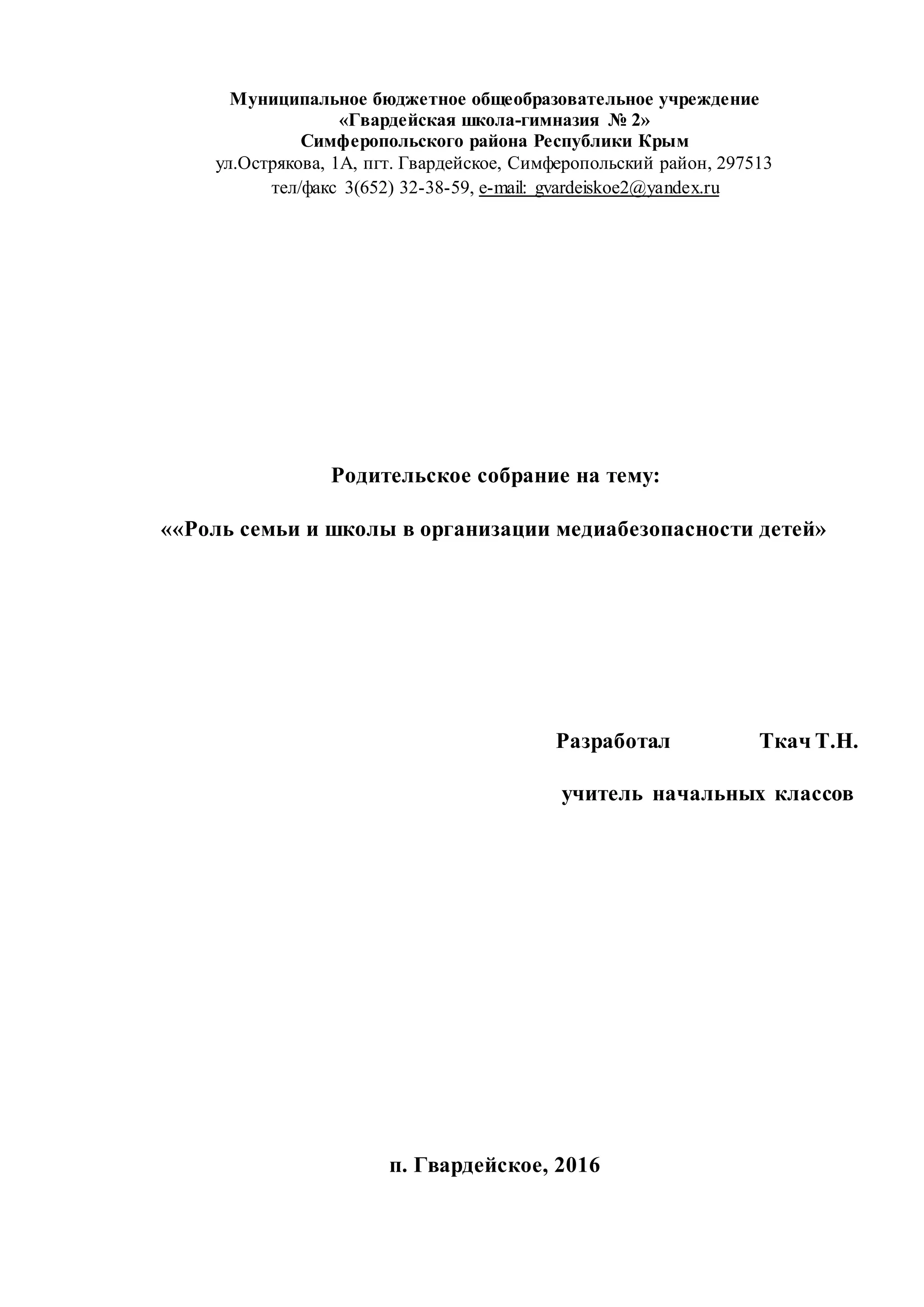 Документ описывает родительское собрание в гимназии, посвященное роли семьи и школы в медиабезопасности детей. Целью собрания является обучение родителей навыкам безопасного поведения в интернете, а также распознаванию опасной информации и манипуляций. Ожидается, что родители смогут критически относиться к информации в сети и обучат детей безопасным интернет-практикам.
