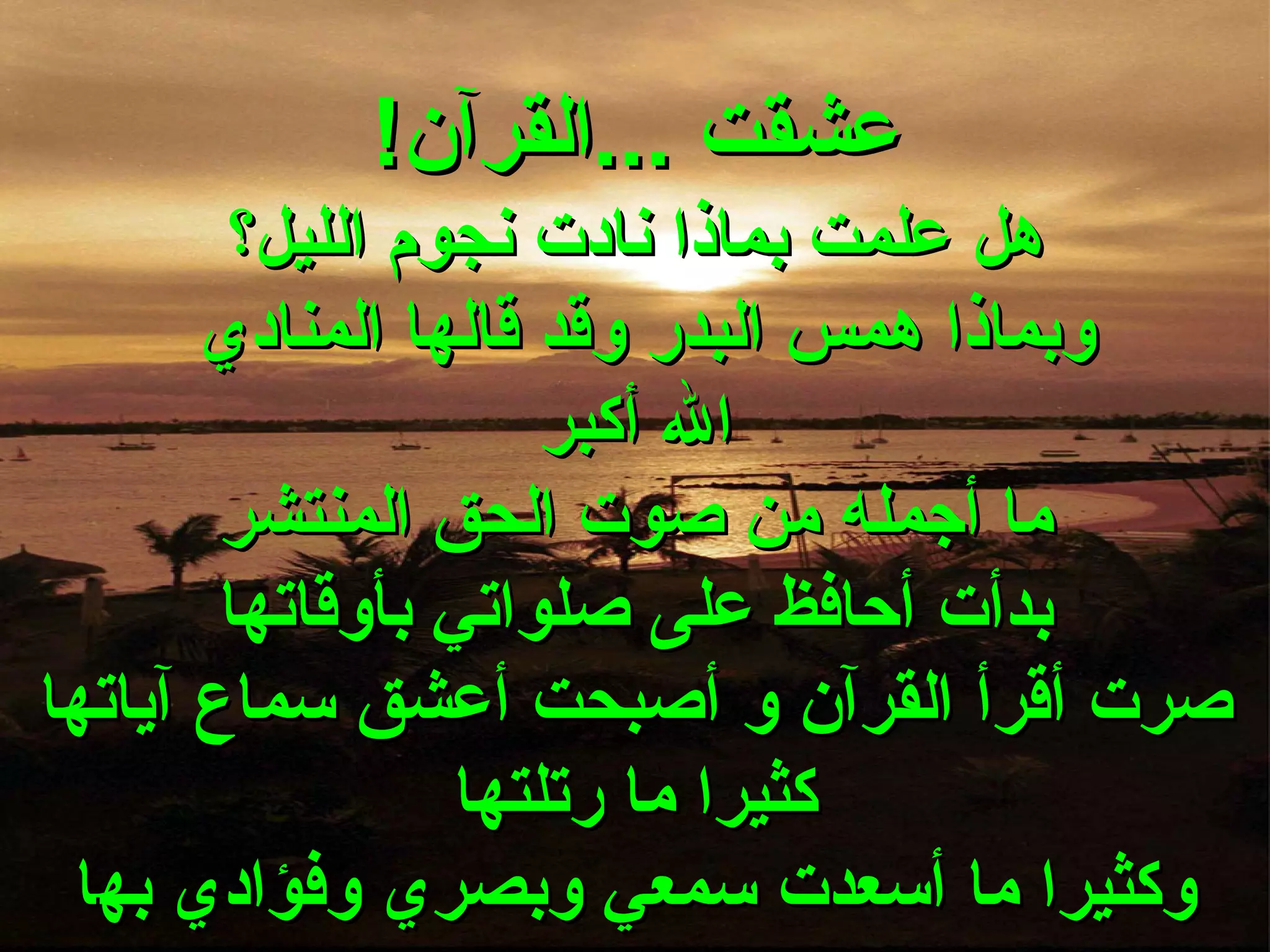 عشقت ...القرآن ! هل علمت بماذا نادت نجوم الليل؟ وبماذا همس البدر وقد قالها المنادي الله أكبر ما أجمله من صوت الحق المنتشر بدأت أحافظ على صلواتي بأوقاتها صرت أقرأ القرآن و أصبحت أعشق سماع آياتها كثيرا ما رتلتها وكثيرا ما أسعدت سمعي وبصري وفؤادي به ا