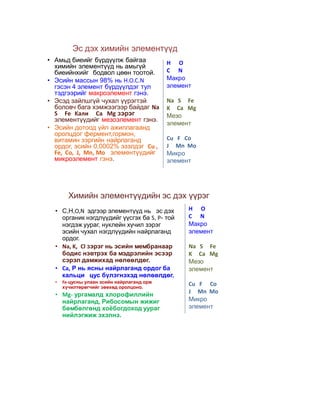 • С,Н,О,N эдгээр элементүүд нь эс дэх H O