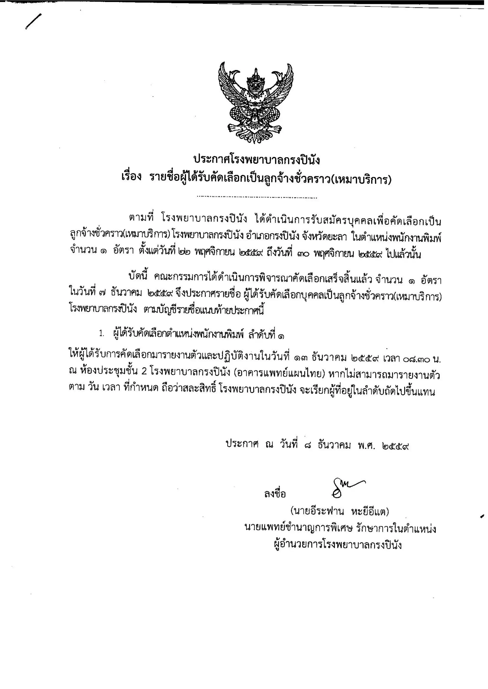 ประกาศผู้ได้รับคัดเลือก พนักงานพิมพ์ รพ.กรงปินัง
