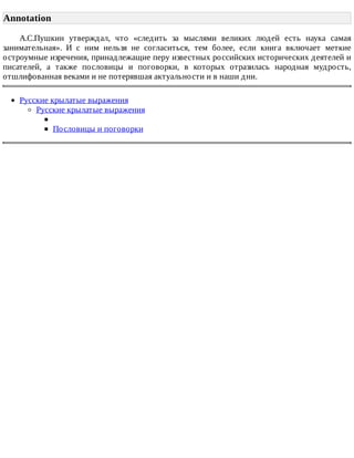 Документ представляет собой сборник русских крылатых выражений, пословиц и цитат из произведений известных авторов, таких как А.С. Пушкин, А.С. Грибоедов и Н.В. Гоголь. Каждое выражение сопровождено кратким пояснением его значения и контекста использования, что подчеркивает богатство русского языка и народной мудрости. В тексте акцентируется внимание на актуальности этих высказываний и их роли в культурной традиции России.