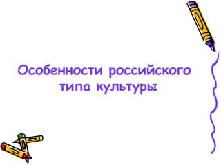 Документ анализирует особенности русского культурного архетипа, выделяя его ментальность и характерные черты, такие как коллективизм, терпеливость и консерватизм. Рассматриваются философские взгляды русских мыслителей на национальный характер и влияние различных культур. Документ также содержит тесты для проверки знаний о российской культуре.