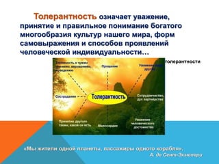 Документ посвящен развитию толерантности и уважения к культурному многообразию, подчеркивая важность принятия различных культур и индивидуальностей. Он описывает концепцию толерантности, предлагает меры по профилактике экстремизма, а также предлагает различные формы работы с детьми, молодежью и мигрантами. Особое внимание уделяется библиотечным услугам для представительства многообразия и необходимости адаптации их под нужды всех сообществ.