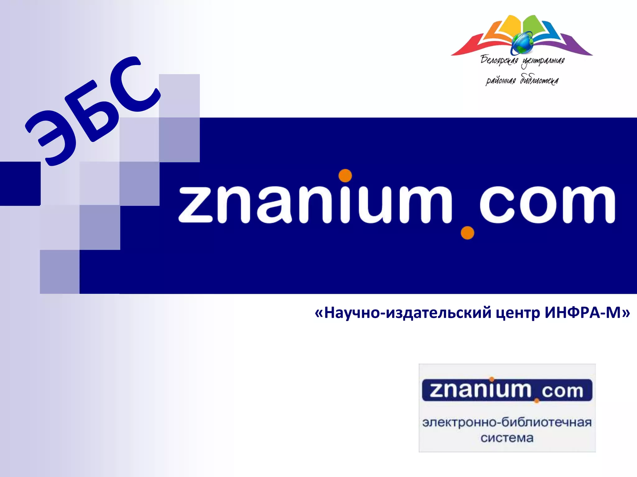 Электронная библиотечная система (ЭБС) Znanium.com предоставляет доступ к более 10 000 учебников и научных материалов для студентов и преподавателей. Система предлагает возможности поиска и отбора документов, виртуальные полки, создание закладок и отчетов по использованию. Доступ к полным текстам требует авторизации, а использование системы возможно через различные браузеры на электронных устройствах.