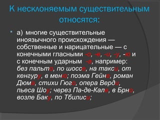 Документ обсуждает случаи несклоняемых существительных в русском языке, приводя примеры и правила их использования в различных падежах. Рассматриваются как иноязычные слова, так и русские фамилии и сложносокращённые выражения. Также приведены задания для практики в употреблении глаголов и существительных в предложениях.
