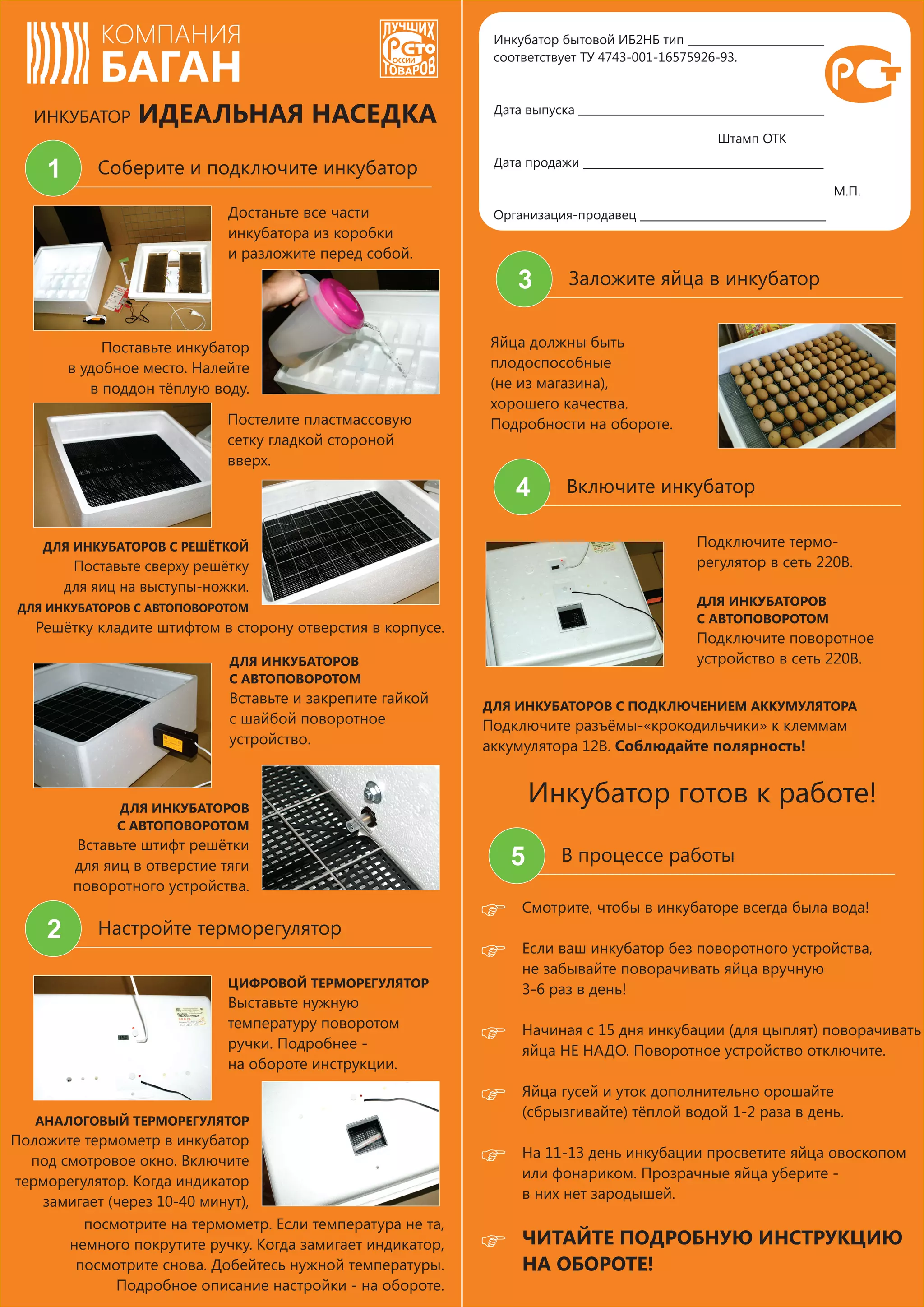 Документ описывает инструкции по использованию инкубатора "Идеальная наседка" для инкубации различных видов птиц. Включает рекомендации по подключению, настройке температуры и уходу за яйцами в процессе инкубации. Также указаны требования безопасности и подготовительные шаги перед началом работы инкубатора.