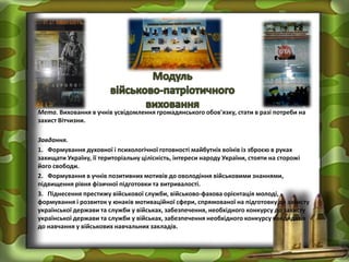 Модуль "Військово патріотичне виховання" 1. Мета. Виховання в учнів усвідомлення громадянського обов'язку, стати в разі потреби на