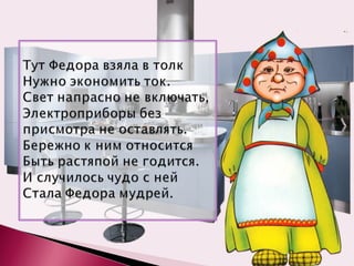 Сказка об электроприборах рассказывает о взаимодействии различных устройств в доме Федоры. Электроприборы, такие как чайник и телевизор, общаются и создают атмосферу радости в доме. История подчеркивает важность и веселье, которые могут приносить повседневные предметы.