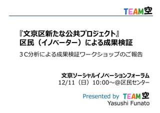 『文京区新たな公共プロジェクト』 区⺠(イノベーター)による成果検証 3C分析による成果検証ワークショップのご報告 文京ソーシャルイノベーションフォーラム 12/11(日)10:00〜@区⺠センター Presented by TEAM空 Yasushi
