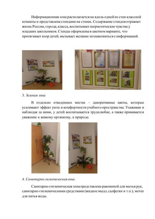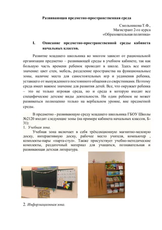 Документ описывает важность предметно-пространственной среды для развития младших школьников в учебном кабинете, выделяя различные зоны, такие как учебная, информационная, зеленая и санитарно-гигиеническая. Предлагаются рекомендации по улучшению среды, включая создание игровой и спортивно-оздоровительной зон, что поможет повысить здоровье и стабильное психологическое состояние детей. Кроме того, предлагается организовать место для выставки детских работ для развития творческих способностей учеников.