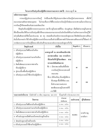 สนอง มฐ.ที่ 16 ั หลักการและเหตุผล การจะปฏิรูปกระบวนการเรียนรู จําเปนจะตองใชรูปแบบการจัดการเรียนรูอยางหลากหลาย เพื่อให เหมาะสมตามศักยภาพของบุคคล ไมวาจะเปนการใชสื่อ/แหลงการเรียนรูหรือจัดบรรยากาศรวมถึงการกิจกรรม การเรียนรูใหสอดคลองกับธรรมชาติของวิชา ปจจุบนหองปฏิบัติการคหกรรม(อาคาร 100 ป) อยูในสภาพทีรอน ประตูชํารุด เปดปดลําบากอยูในสภาพ ั ่ ที่จําเปนจะตองไดรับการปรับปรุงเพื่อใหเหมาะสมและสามารถรองรับนักเรียนที่เขามารวมกิจกรรมการเรียนรูได อยางเต็มศักยภาพไดครั้งละประมาณ 40 คน สอดคลองกับหลักการของหลักสูตรและวิสัยทัศนของสถานศึกษา ดังนั้นจึงอาจกลาวไดวาหองปฏิบัติการเหลานี้สามารถเปนตัวบงชี้ถึงสภาพทั่วไปของสถานศึกษาแหงนี้ไดเลยวา มี การจัดกระบวนการเรียนรูทสอด คลองกับเปาหมายและหลักการของหลักสูตรหรือไม ี่ วัตถุประสงค ตัวชี้วัด ขอมูลเดิม % เปาหมาย % 1. ปรับปรุงระบบไฟฟาภายในหอง มาตรฐานที่ 16 สถานศึกษามีการจัด ปฏิบัติการ สภาพแวดลอม และ การบริการ 2. ปรับปรุงระบบแสงสวางภายในหอง ที่สงเสริมให ผูเรียนพัฒนา ตาม ปฏิบัติการ 3. ติดตั้งพัดลมระบายอากาศภายใน ธรรมชาติเต็มศักยภาพ หองปฏิบัติการ ขอ 1 มีสภาพแวดลอมที่เอื้อตอ 40 100 4. ปูกระเบื้องพืนหองปฏิบัติการ ้ การเรียนรู มีอาคารสถานที่ 5. ปรับปรุงระบบน้ําใชภายในปฏิบัติการ เหมาะสม ขอ 4. มีหองเรียน หองปฏิบัติการ หองสมุด พื้นที่สีเขียว และ 40 100 สิ่งอํานวยความสะดวก พอเพียงและอยูในสภาพใช การไดดี ระยะเวลาดําเนินงาน เริ่มตนวันที่ 16 เดือน พฤษภาคม พ.ศ. 2553 สิ้นสุดวันที่ 31 มีนาคม พ.ศ. 2554 ชวงเวลา กิจกรรม งบประมาณ ผูรับผิดชอบ ดําเนินงาน 1. ปรับปรุงระบบไฟฟาภายในหองปฏิบัติการ 16 พ.ค. – 10 มี.ค. 2. ปรับปรุงระบบแสงสวางภายในหองปฏิบัติการ 16 พ.ค. – 10 มี.ค. 3. ติดตั้งพัดลมระบายอากาศภายในหองปฏิบัติการ 16 พ.ค. – 10 มี.ค. นางสําราญ 40,000.- 4. สรางประตูบานเปดดานหนาแทนประตูบานมวน 16 พ.ค. – 10 มี.ค. นางอัมรา 5. ซอมประตูบานมวนดานหลัง 16 พ.ค. – 10 มี.ค. 6. ปรับปรุงระบบน้ําใชภายในปฏิบัติการ 16 พ.ค. – 10 มี.ค.