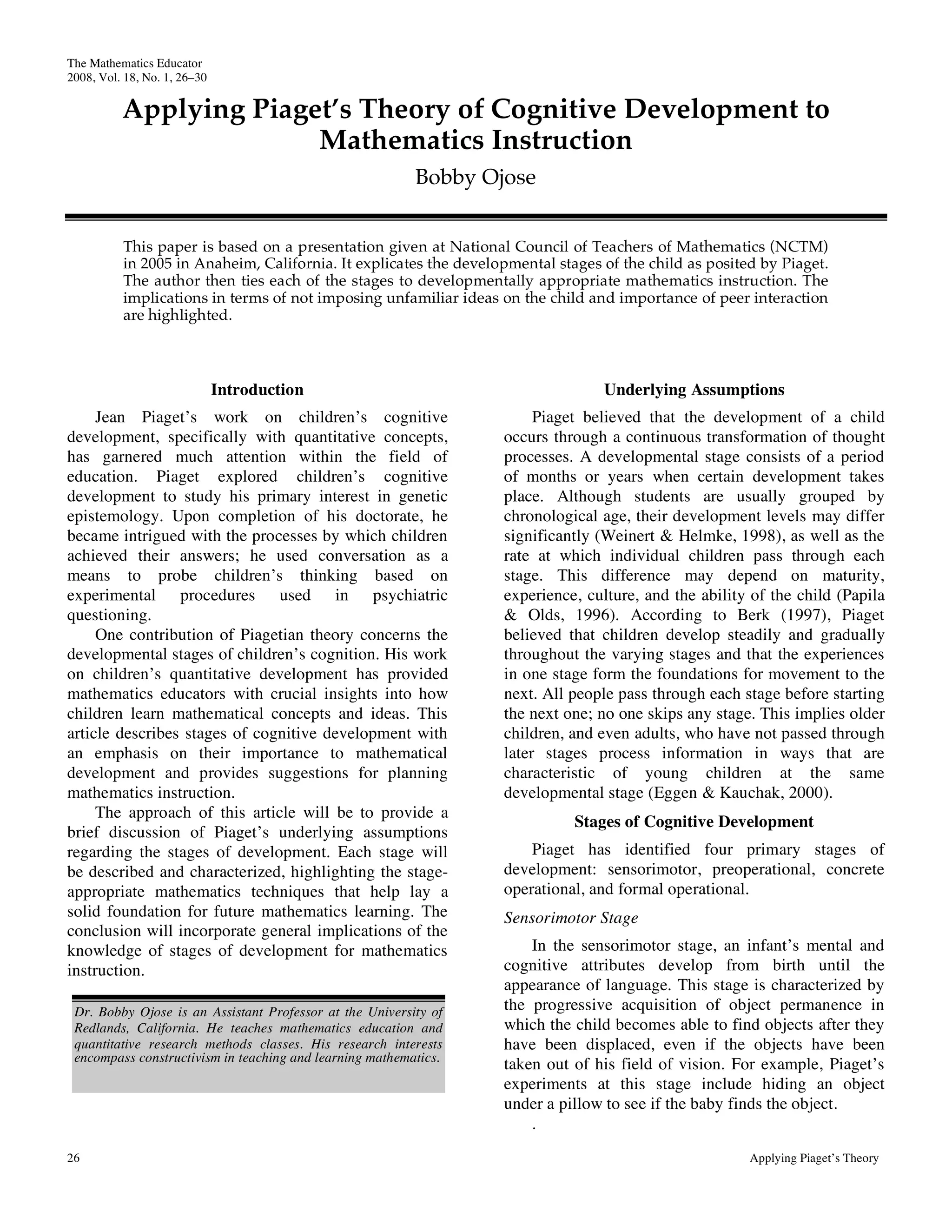 The document summarizes Piaget's theory of cognitive development and its implications for mathematics instruction. It describes the four stages of cognitive development according to Piaget - sensorimotor, preoperational, concrete operational, and formal operational. For each stage, it provides examples of characteristics and abilities, as well as suggestions for developmentally appropriate mathematics activities and instruction. The summary concludes that understanding Piaget's stages helps teachers plan activities matched to students' cognitive levels to support mathematical development.