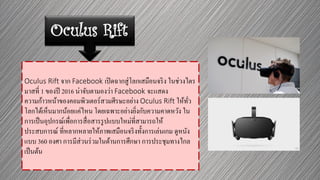 จาก Facebook เปิดฉากสู่โลกเสมือนจริง ในช่วงไตร มาสที่ 1 ของปี 2016 น่าจับตามองว่า Facebook จะแสดง ความก้าวหน้าของคอมพิวเตอร์สวมศีรษะอย่าง Oculus Rift ให้ทั่ว โลกได้เห็นมากน้อยแค่ไหน โดยเฉพาะอย่างยิ่งกับความคาดหวัง ใน การเป็นอุปกรณ์เพื่อการสื่อสารรูปแบบใหม่ที่สามารถให้ ประสบการณ์ ที่หลากหลายให้ภาพเสมือนจริงทั้งการเล่นเกม ดูหนัง แบบ 360 องศา การมีส่วนร่วมในด้านการศึกษา การประชุมทางไกล เป็นต้น