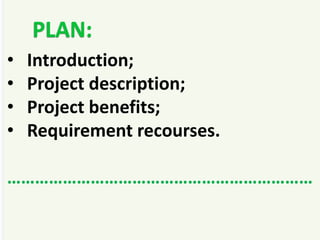 The document outlines a plan to address ecological problems by engaging students in tree planting. It describes introducing the issue through lectures to recruit volunteers, renting a bus to transport students to the planting site, and lists the resources needed for the project including tools, transportation, and seedlings. The project aims to raise awareness of deforestation issues and involve youth in helping to solve environmental degradation problems.