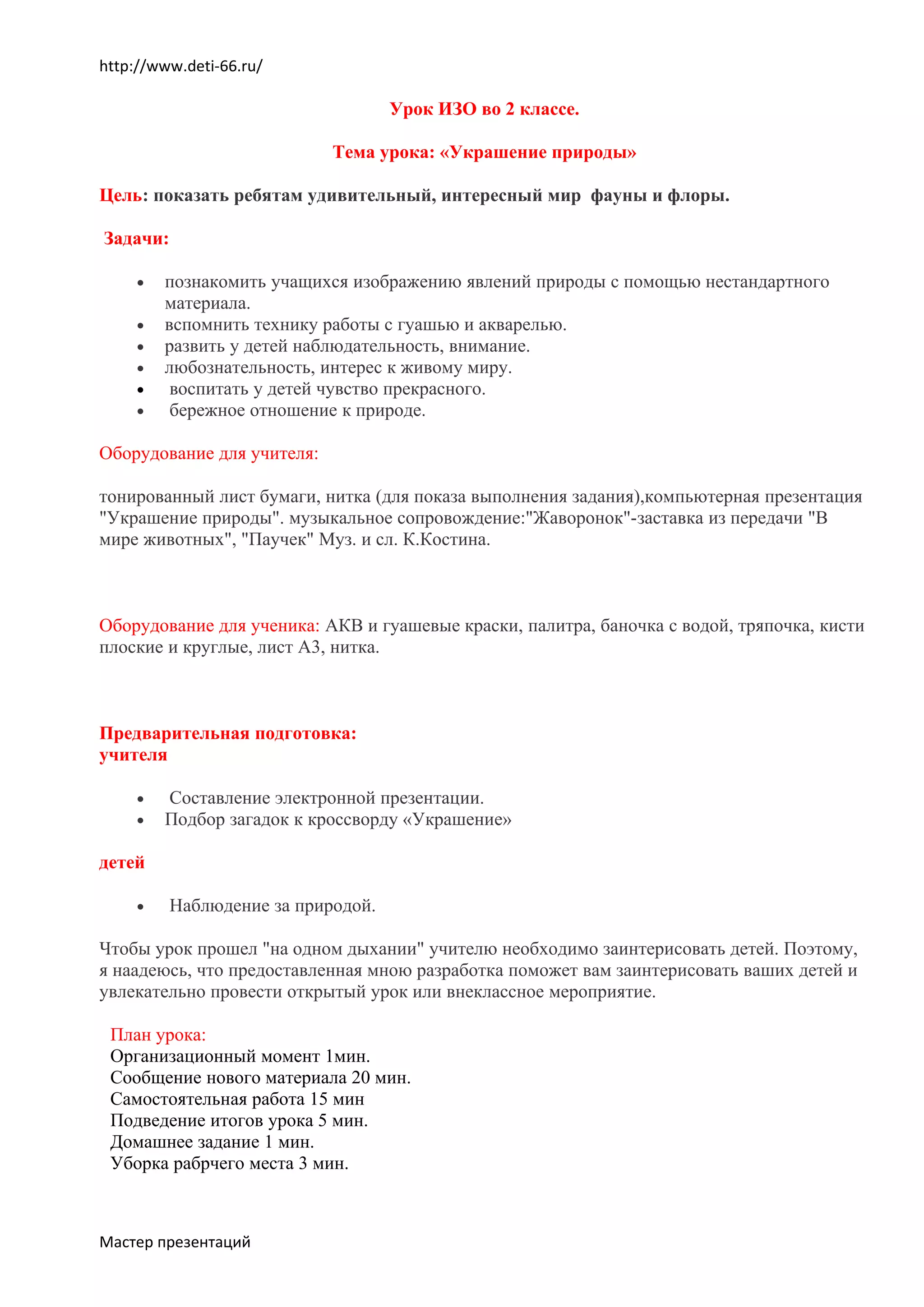 Документ представляет собой план урока изобразительного искусства для 2 класса на тему 'украшение природы'. Целью урока является знакомство учащихся с красотой природы и развитие их творческих навыков через использование нестандартных материалов. В ходе занятия предусмотрены различные активности, включая просмотр презентации, выполнение творческого задания и обсуждение результатов.