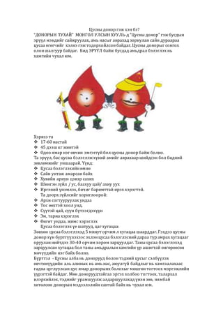 “ДОНОРЫН ТУХАЙ” МОНГОЛ УЛСЫН ХУУЛЬ-д ”Цусны донор” гэж бусдын