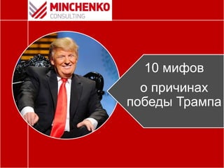 Документ анализирует причины победы Дональда Трампа на выборах 2016 года, опровергая распространенные мифы и представления о выборах. В нем подчеркиваются факторы, такие как цикличность выборов, недостаточная мобилизация избирателей Хиллари Клинтон и реакция ее предвыборной команды на критику. Также документ описывает стратегию Трампа, его взаимодействие с электоратом и медиа, которые сыграли важную роль в исходе выборов.