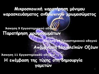 26Μέθοδοι ζωνοποίησηςΜέθοδοι ζωνοποίησης:Qζώνες: χρώση με φθορίζουσα μουσταρδί της κινακρίνηςG ζώνες: χρώση με GiemsaR ζώνες: εμφανίζονται μετά από ελεγχόμενη αναδιάταξη του DNA με Q (φωτογραφικό αρνητικό των Q και G)C ζώνες: χρώση με Giemsa μετά από αποδιάταξη των χρωμοσωμάτων με άλκαλι ή θερμότηταΤ ζώνες: χρώση τελομερούςΣήμερα υπάρχουν σύγχρονες τεχνικές ανάλυσης του καρυότυπου:ΑυτοραδιογραφίαΚυτταρομετρία ροής (flow cytometry)In situ υβριδοποίηση με βοήθεια φθορισμού (FISH)Πλέον οι ερευνητές δεν είναι αναγκασμένοι να κόβουν και να κολλούν χρωμοσώματα από φωτογραφίες για την κατασκευή των καρυότυπων. Με τη χρήση ηλεκτρονικών υπολογιστών ο καρυότυπος είναι έτοιμος σε λίγα λεπτά.26