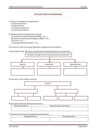 Документ представляет собой учебный материал по обществоведению для 10 класса, охватывающий основные аспекты государственной экономики. В нем описываются процессы утверждения государственного бюджета, определяются ключевые экономические термины и предлагаются схемы для визуализации функций государства и налогов. Также приведены таблицы для заполнения, касающиеся функций налогов и структуры государственного бюджета.