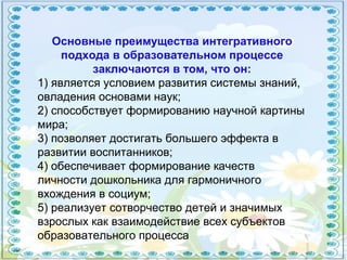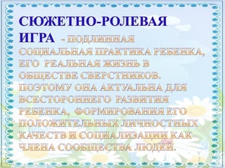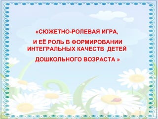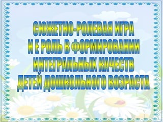Документ обсуждает важность сюжетно-ролевой игры в формировании интегральных качеств детей дошкольного возраста, подчеркивая ее роль в образовательном процессе. Он выделяет ключевые преимущества интегративного подхода и описывает основные качеств, которые должны развиваться у детей, включая физическое, эмоциональное и интеллектуальное развитие. Также рассматриваются процессы социализации и значимость игровой деятельности для успешной интеграции ребенка в общество.