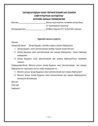 “Зочид буудлын хоолүйлчилгээний зал зохион <br />байгуулалтын асуудлууд”<br />Курсийн ажлын төлөвлөгөө<br />Батлав:Аялал жуулчлалын тэнхмийн ахлах багш <br />Э. Ууганжаргал /магистр/<br />Боловсруулсан:М.Мөнх-Эрдэнэ /317-р бүлгийн оюутан/<br />Курсийн ажлын агуулга<br />Оршил<br />Нэгдүгээр бүлэг:Зочид буудал, зоогийн газрын зохион байгуулалт<br />Зочид буудал, хоол үйлчилгээний салбар түүний тухай ойлголт - 2.