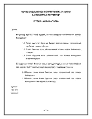 Монгол улсын зочидбуудлын хоол үйлчилгээний зал зохион байгуулалтыг хөгжүүлэх боломжуудДүгнэлт<br />Ном зүй<br />Хавсралт<br />“Зочид буудлын хоол үйлчилгээний зал зохион <br />байгуулалтын асуудлууд”<br />Курсийн ажлын агуулга<br />Оршил<br />Нэгдүгээр бүлэг: Зочид буудал, зоогийн газрын үйлчилгээний зохион байгуулалт<br />Аялал жуулчлал ба зочид буудал, зоогийн газрын үйлчилгээний салбарын талаарх ойлголт - 5.