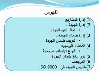 تناقش الوثيقة إدارة جودة البرمجيات وأهمية ضمان الجودة في تطوير البرمجيات، حيث تركز على تعريف الجودة وعمليات إدارة الجودة اللازمة لتحقيق المنتجات البرمجية التي تلبي توقعات العملاء. تشمل الوثيقة كذلك المعايير والعمليات المستخدمة في ضمان الجودة والتقنيات المتعلقة بذلك، بما في ذلك اختبار البرمجيات والمراجعات الرسمية. بالإضافة إلى ذلك، تتناول الوثيقة أهمية التواصل والتعاون بين الفرق المختلفة لضمان جودة المنتج النهائي.