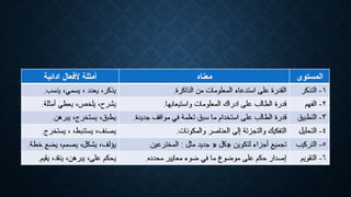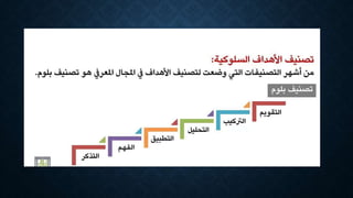 تتناول الوثيقة تصنيف بلوم الذي يركز على فهم الطالب وتحليل المعلومات وتفسيرها. يسلط الضوء على أهمية الفهم كخطوة أساسية في عملية التعلم والتدريس، مع تقديم أمثلة متعددة على كيفية صياغة الأهداف التعليمية وقياس مستوى الفهم لدى الطلاب.