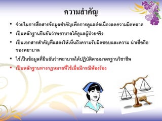 เป็นเอกสารสาคัญที่แสดงให้เห็นถึงความรับผิดชอบและความ น่าเชื่อถือ ของพยาบาล • ใช้เป็นข้อมูลที่ยืนยันว่าพยาบาลได้ปฏิบัติตามมาตรฐานวิชาชีพ • เป็นหลักฐานทางกฎหมายที่ใช้เมื่อมีกรณีฟ้องร้อง