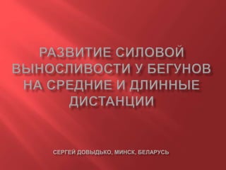 Документ описывает методы совершенствования системы специальной силовой подготовки для бегунов на средние и длинные дистанции, включая разнообразные упражнения, такие как прыжки и бег с акцентом на развитие силы и выносливости. Приведены конкретные виды упражнений и их направленность, распределение тренировок по годичному циклу. Также содержится информация о применении силовой гимнастики и других тренировочных методов.