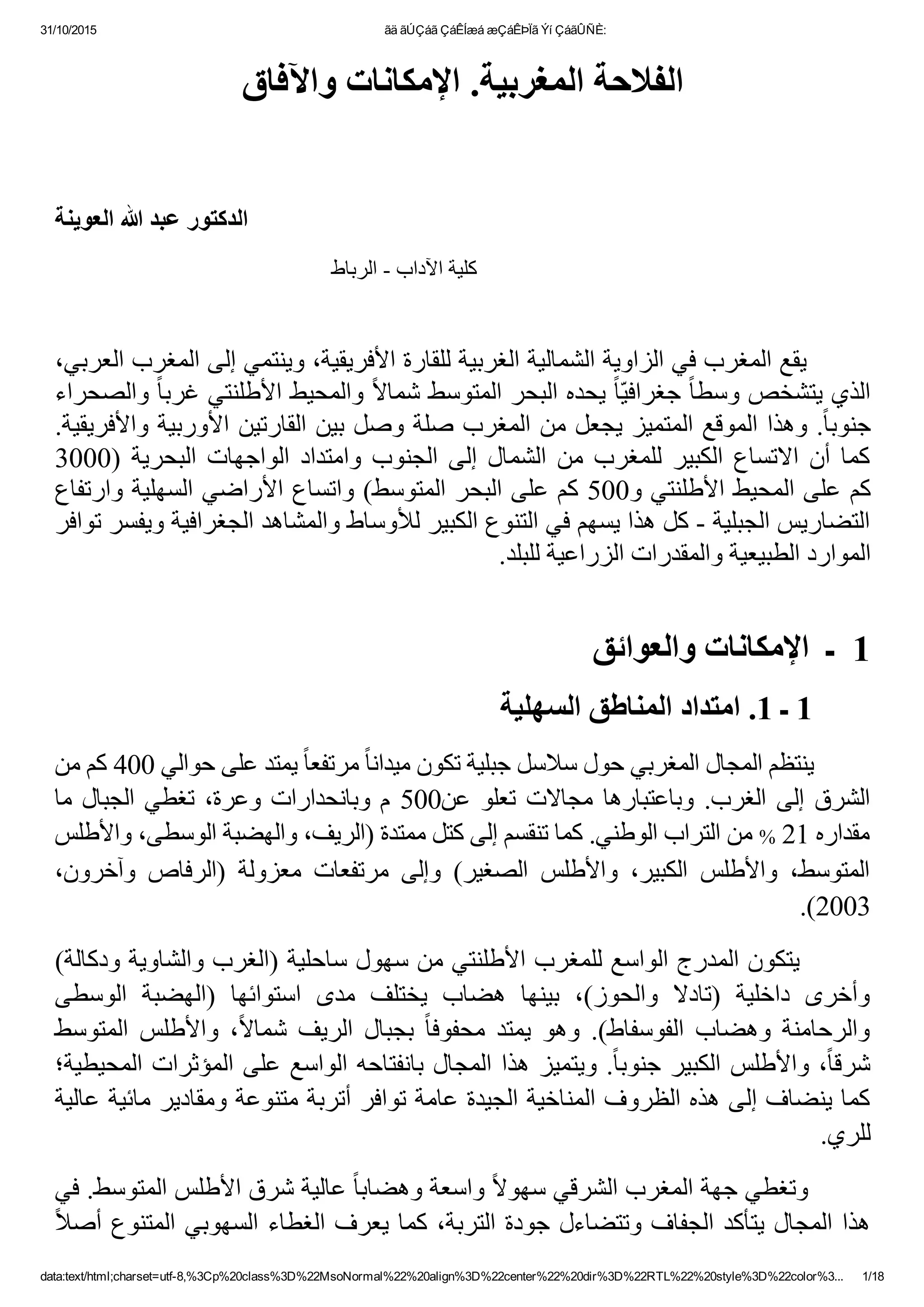 31/10/2015 ãä ãÚÇáã ÇáÊÍæá æÇáÊÞÏã Ýí ÇáãÛÑÈ: data:text/html;charset=utf8,%3Cp%20class%3D%22MsoNormal%22%20align%3D%22center%22%20dir%3D%22RTL%22%20style%3D%22color%3... 1/18 ﺍﻟﻔﻼﺣﺔ ﺍﻟﻤﻐﺮﺑﻴﺔ. ﺍﻹﻣﻜﺎﻧﺎﺕ ﻭﺍﻵﻓﺎﻕ ﺍﻟﺪﻛﺘﻮﺭ ﻋﺒﺪ ﷲ ﺍﻟﻌﻮﻳﻨﺔ ﻛﻠﻴﺔ ﺍﻵﺩﺍﺏ ﺍﻟﺮﺑﺎﻁ ٬ ﻳﻘﻊ ﺍﻟﻤﻐﺮﺏ ﻓﻲ ﺍﻟﺰﺍﻭﻳﺔ ﺍﻟﺸﻤﺎﻟﻴﺔ ﺍﻟﻐﺮﺑﻴﺔ ﻟﻠﻘﺎﺭﺓ ﺍﻷﻓﺮﻳﻘﻴﺔ٬ ﻭﻳﻨﺘﻤﻲ ﺇﻟﻰ ﺍﻟﻤﻐﺮﺏ ﺍﻟﻌﺮﺑﻲ ﻭﺍﻟﺼﺤﺮﺍءًﺎ ﻭﺍﻟﻤﺤﻴﻂ ﺍﻷﻁﻠﻨﺘﻲ ﻏﺮﺑًﻻ ﻳﺤﺪﻩ ﺍﻟﺒﺤﺮ ﺍﻟﻤﺘﻮﺳﻂ ﺷﻤﺎًﺎّﻴ ﺟﻐﺮﺍﻓًﺎﺍﻟﺬﻱ ﻳﺘﺸﺨﺺ ﻭﺳﻄ .. ﻭﻫﺬﺍ ﺍﻟﻤﻮﻗﻊ ﺍﻟﻤﺘﻤﻴﺰ ﻳﺠﻌﻞ ﻣﻦ ﺍﻟﻤﻐﺮﺏ ﺻﻠﺔ ﻭﺻﻞ ﺑﻴﻦ ﺍﻟﻘﺎﺭﺗﻴﻦ ﺍﻷﻭﺭﺑﻴﺔ ﻭﺍﻷﻓﺮﻳﻘﻴﺔًﺎﺟﻨﻮﺑ 3000) ﺍﻟﺒﺤﺮﻳﺔ ﺍﻟﻮﺍﺟﻬﺎﺕ ﻭﺍﻣﺘﺪﺍﺩ ﺍﻟﺠﻨﻮﺏ ﺇﻟﻰ ﺍﻟﺸﻤﺎﻝ ﻣﻦ ﻟﻠﻤﻐﺮﺏ ﺍﻟﻜﺒﻴﺮ ﺍﻻﺗﺴﺎﻉ ﺃﻥ ﻛﻤﺎ ﻛﻢ ﻋﻠﻰ ﺍﻟﻤﺤﻴﻂ ﺍﻷﻁﻠﻨﺘﻲ ﻭ005 ﻛﻢ ﻋﻠﻰ ﺍﻟﺒﺤﺮ ﺍﻟﻤﺘﻮﺳﻂ( ﻭﺍﺗﺴﺎﻉ ﺍﻷﺭﺍﺿﻲ ﺍﻟﺴﻬﻠﻴﺔ ﻭﺍﺭﺗﻔﺎﻉ ﺍﻟﺘﻀﺎﺭﻳﺲ ﺍﻟﺠﺒﻠﻴﺔ ﻛﻞ ﻫﺬﺍ ﻳﺴﻬﻢ ﻓﻲ ﺍﻟﺘﻨﻮﻉ ﺍﻟﻜﺒﻴﺮ ﻟﻸﻭﺳﺎﻁ ﻭﺍﻟﻤﺸﺎﻫﺪ ﺍﻟﺠﻐﺮﺍﻓﻴﺔ ﻭﻳﻔﺴﺮ ﺗﻮﺍﻓﺮ .ﺍﻟﻤﻮﺍﺭﺩ ﺍﻟﻄﺒﻴﻌﻴﺔ ﻭﺍﻟﻤﻘﺪﺭﺍﺕ ﺍﻟﺰﺭﺍﻋﻴﺔ ﻟﻠﺒﻠﺪ 1 ـ ﺍﻹﻣﻜﺎﻧﺎﺕ ﻭﺍﻟﻌﻮﺍﺋﻖ 1 ـ 1. ﺍﻣﺘﺪﺍﺩ ﺍﻟﻤﻨﺎﻁﻖ ﺍﻟﺴﻬﻠﻴﺔ ﻳﻤﺘﺪ ﻋﻠﻰ ﺣﻮﺍﻟﻲ 004 ﻛﻢ ﻣﻦًﺎ ﻣﺮﺗﻔﻌًﺎ ﻳﻨﺘﻈﻢ ﺍﻟﻤﺠﺎﻝ ﺍﻟﻤﻐﺮﺑﻲ ﺣﻮﻝ ﺳﻼﺳﻞ ﺟﺒﻠﻴﺔ ﺗﻜﻮﻥ ﻣﻴﺪﺍﻧ ﻣﺎ ﺍﻟﺠﺒﺎﻝ ﺗﻐﻄﻲ ٬ﻭﻋﺮﺓ ﻭﺑﺎﻧﺤﺪﺍﺭﺍﺕﻡ 500ﻋﻦ ﺗﻌﻠﻮ ﻣﺠﺎﻻﺕ ﻭﺑﺎﻋﺘﺒﺎﺭﻫﺎ .ﺍﻟﻐﺮﺏ ﺇﻟﻰ ﺍﻟﺸﺮﻕ ﻣﻦ ﺍﻟﺘﺮﺍﺏ ﺍﻟﻮﻁﻨﻲ. ﻛﻤﺎ ﺗﻨﻘﺴﻢ ﺇﻟﻰ ﻛﺘﻞ ﻣﻤﺘﺪﺓ )ﺍﻟﺮﻳﻒ٬ ﻭﺍﻟﻬﻀﺒﺔ ﺍﻟﻮﺳﻄﻰ٬ ﻭﺍﻷﻁﻠﺲ% 21 ﻣﻘﺪﺍﺭﻩ ٬ﻭﺁﺧﺮﻭﻥ