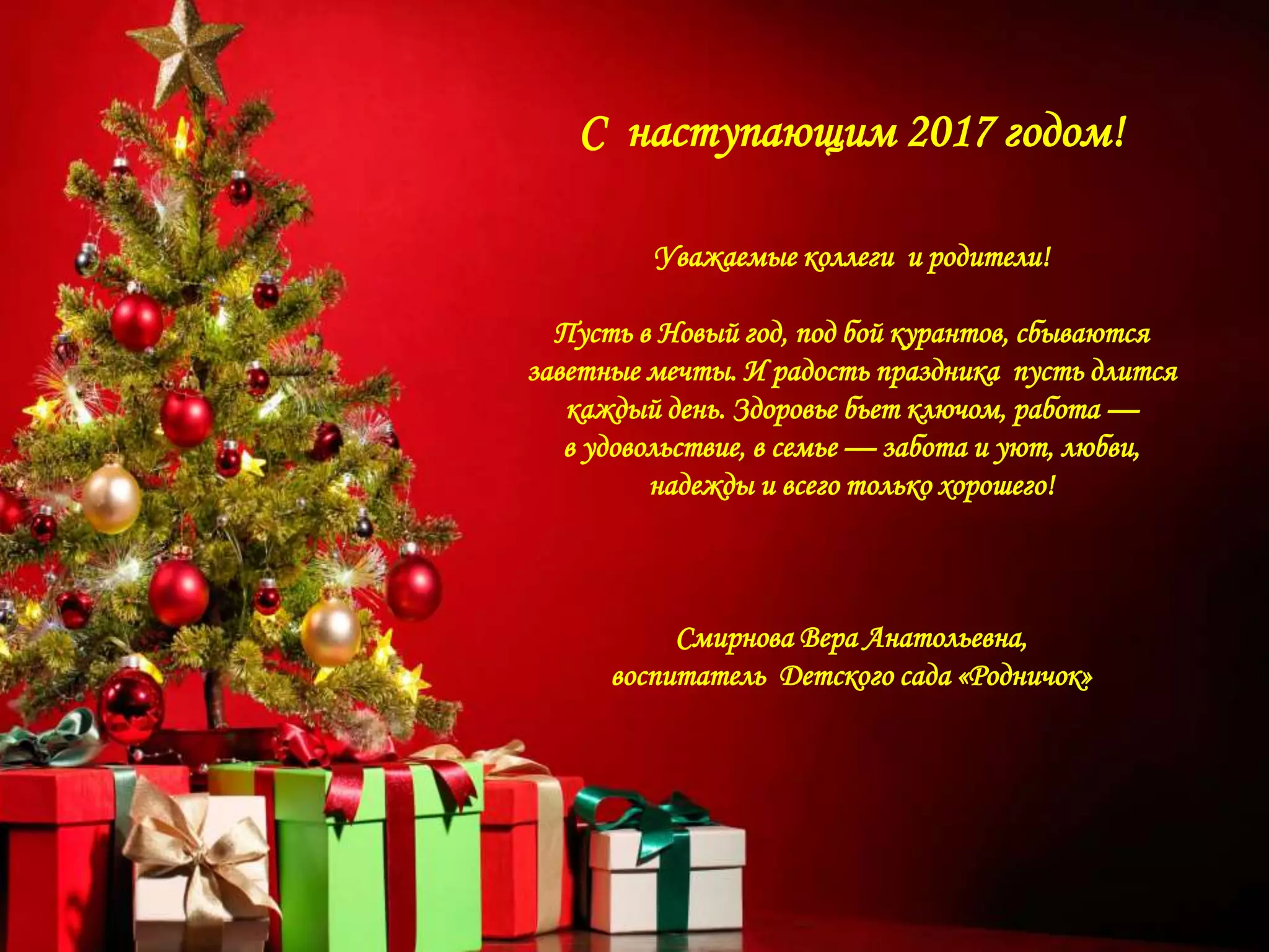 В документе содержится поздравление с наступающим 2017 годом от воспитателя детского сада 'Родничок' Веры Анатольевны. Он передает пожелания здоровья, счастья и уюта для коллег и родителей, а также настоятельно призывает верить в чудеса. Поздравление завершается надеждой на подарки от Дедушки Мороза и радостное празднование Нового года и Рождества.